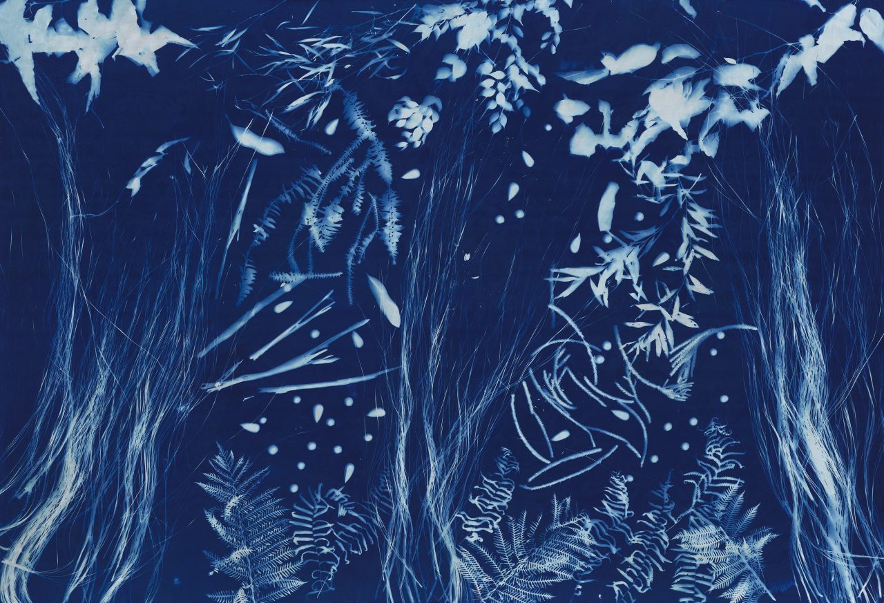 Carmichael’s work Before the Gardens 2 and Before the Gardens 3 are both cyantypes - an analogue photographic printing process that produces images in a dark blue hue. Images are created by layering objects on paper or cloth, which is coated with a UV sensitive wash and then exposing it all to sunlight. Carmichael speaks of the process of layering like the tradition of creating middens on the shores of Minjerribah and the colour she says is ‘deep like the ocean’.