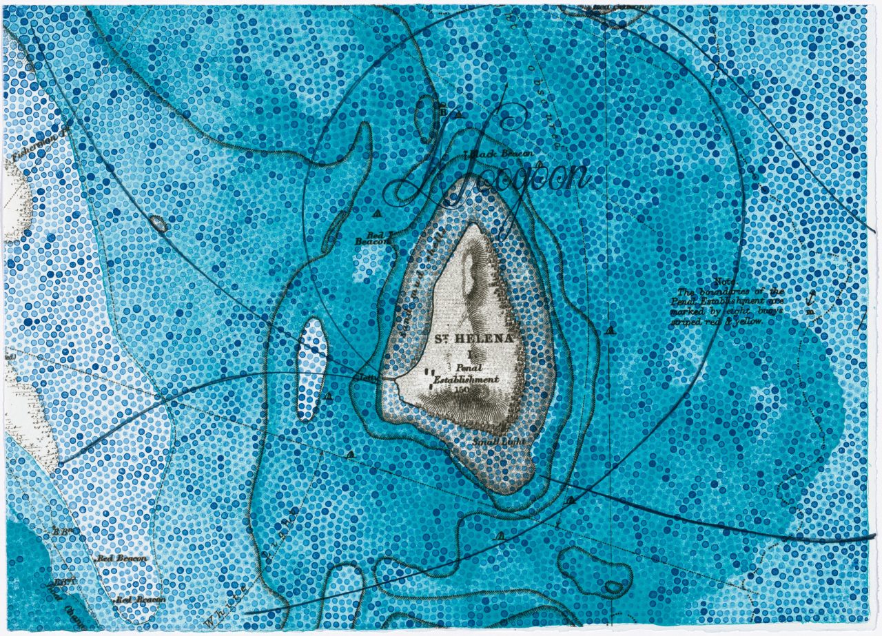 Cope’s work in Trace is Noogoon (St Helena’s Island), a three colour lithograph. It is drawn from her body of work that investigates the devastation of oyster middens in Quandamooka Country, while also reimagining their place and presence. Cope has also traced the presence of lime kilns (built to burn oyster shell to make lime, and in turn make cement, for new colony building materials), around the shoreline of Moreton Bay. Noogoon was a place where labour, supplied from a penal prison built there, enabled a large lime kiln to operate.